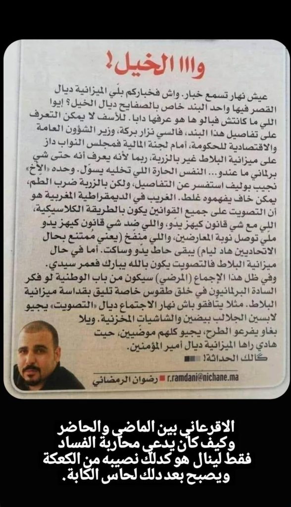 لذلك، فإن هذه الصورة ليست مجرد استحضار لمقال قديم، بل هي مرآة تكشف كيف يمكن لبعض الأشخاص أن ينتقلوا من خطاب “محاربة الفساد” إلى ممارسة الصمت أو التبرير عندما تتغير مصالحهم. وهذا يفرض علينا كمجتمع أن نميز بين من يدافع عن المبادئ، ومن يستعمل المبادئ فقط كورقة تفاوض.