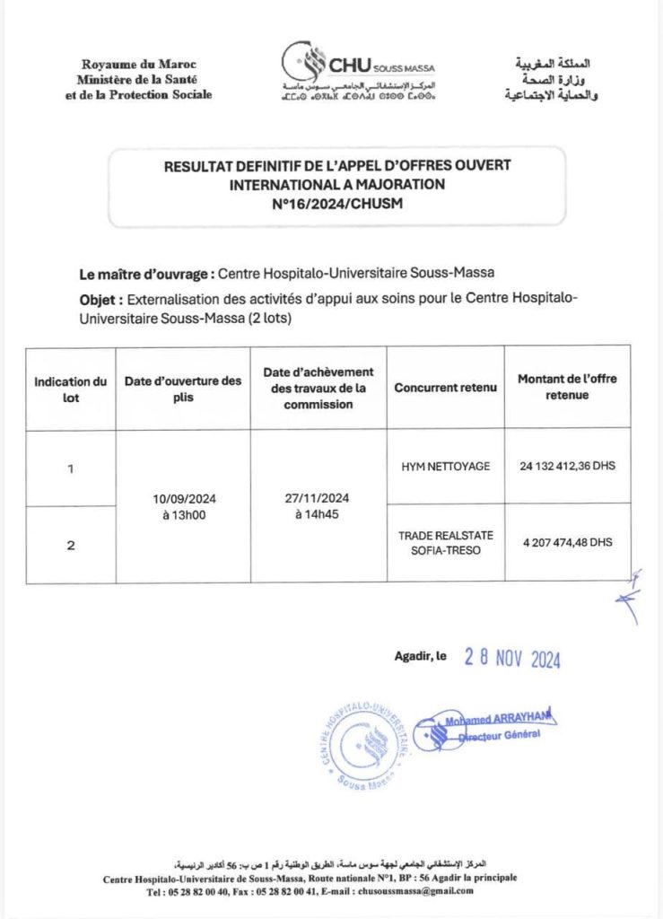 وحسب معطيات وتقارير مستندة إلى وثائق رسمية، فإن الصفقة العمومية رقم 16/2024/CHUSM، المتعلقة بخدمات التمريض بالمستشفى الجامعي محمد السادس بأكادير، أُسندت إلى شركة HYM NETTOYAGE SARL بمبلغ إجمالي ناهز 24.132.412,36 درهم، في ظل مؤشرات تشير إلى اختلالات محتملة في مسار إبرام الصفقة وتنفيذها.